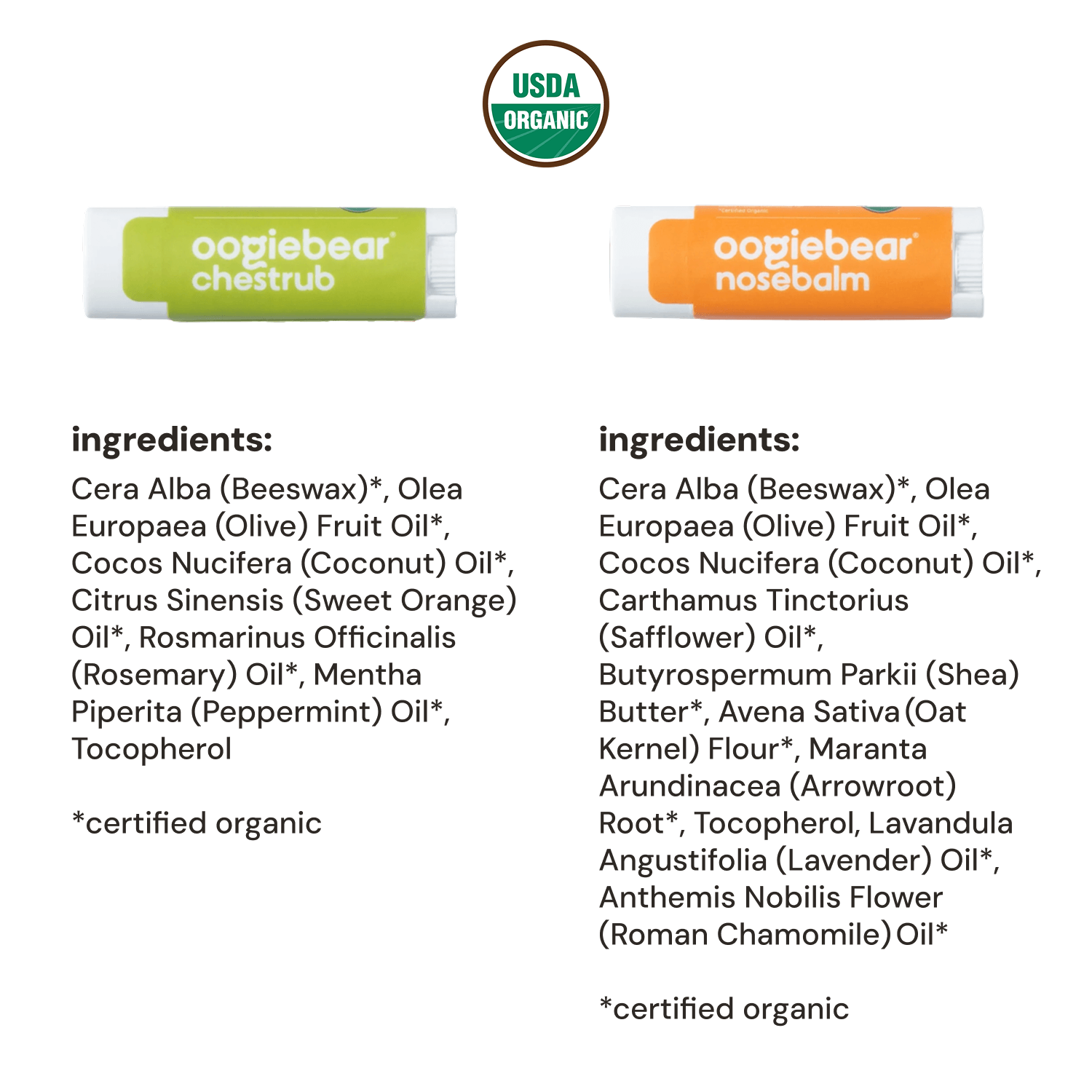 Chest Rub Ingredients: Cera Alba (Beeswax)*, Olea Europaea (Olive) Fruit Oil*, Cocos Nucifera (Coconut) Oil*, Citrus Sinensis (Sweet Orange) Oil*, Rosmarinus Officinalis (Rosemary) Oil*, Mentha Piperita (Peppermint) Oil*, Tocopherol