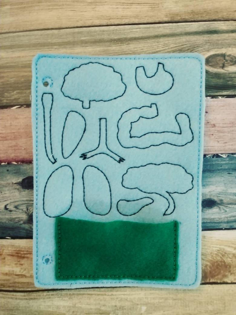 This 5x7 learning board is made out of felt. There are nine organs that you can place on the felt body to learn where your organs belong. You can use the second page to match 9 of the organs to their outline. Five of the organs are already embroidered on the body. The board and organs are made out of two pieces of felt with stabilizer in between. They are then embroidered on my embroidery machine. This set includes