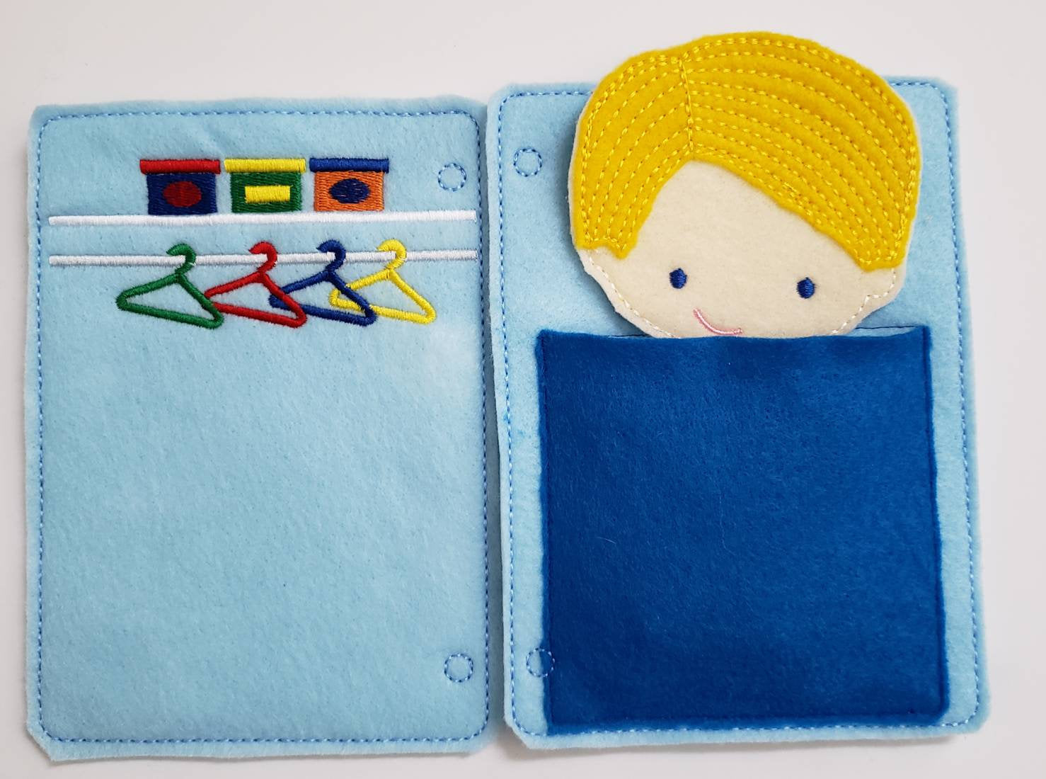 This listing is for a boy felt doll with space suit and pants, shirt and shoes. The doll and clothes are made out of felt and embroidered on my embroidery machine. The back of the doll is made out of vinyl for extra durability. This listing also includes a closet and bed to store your doll and clothes in. Felt naturally sticks to itself, so I don't put anything on the doll or clothes. If you would like to make it sticky I can let you know where to purchase a special glue that works great.