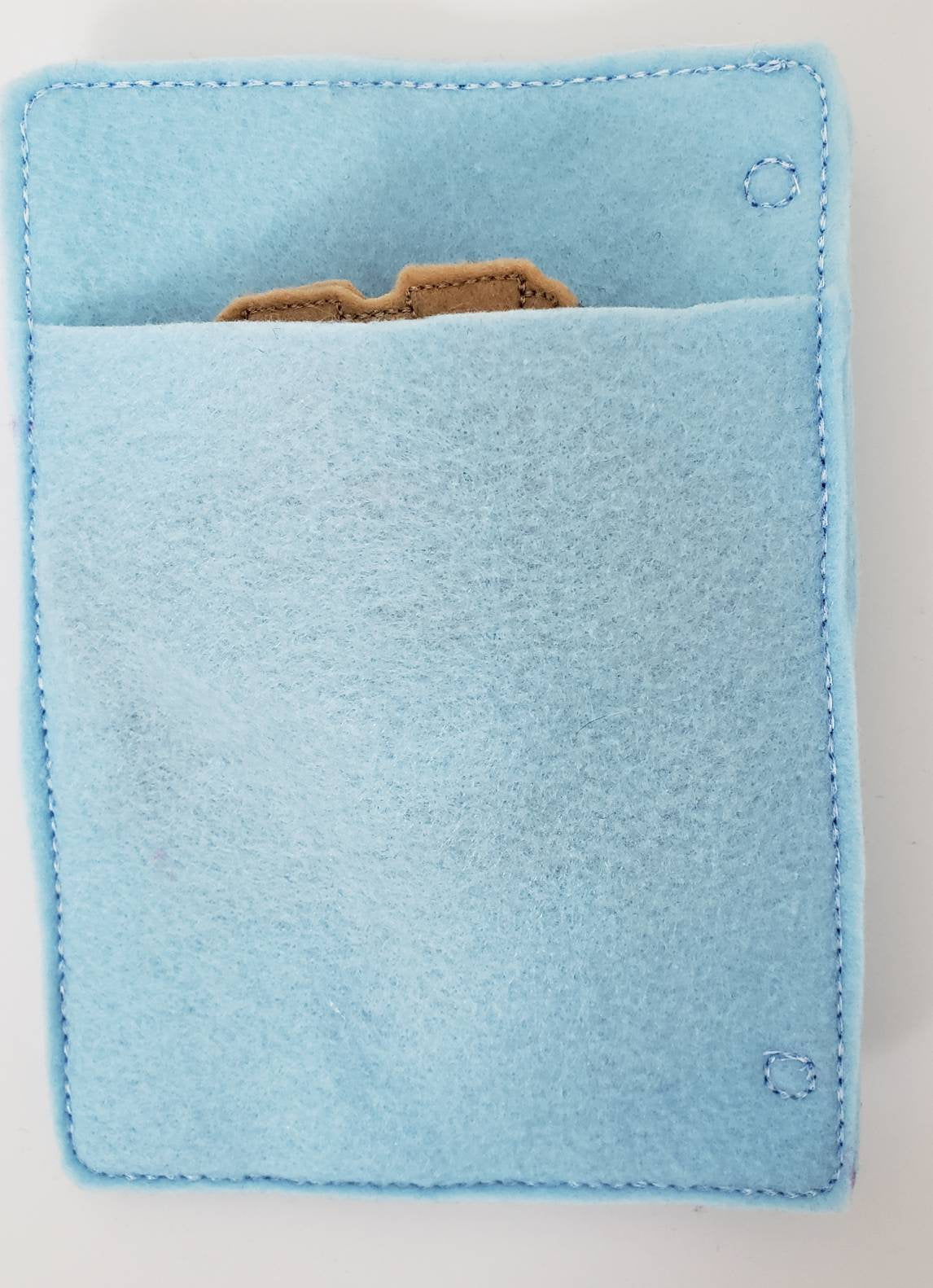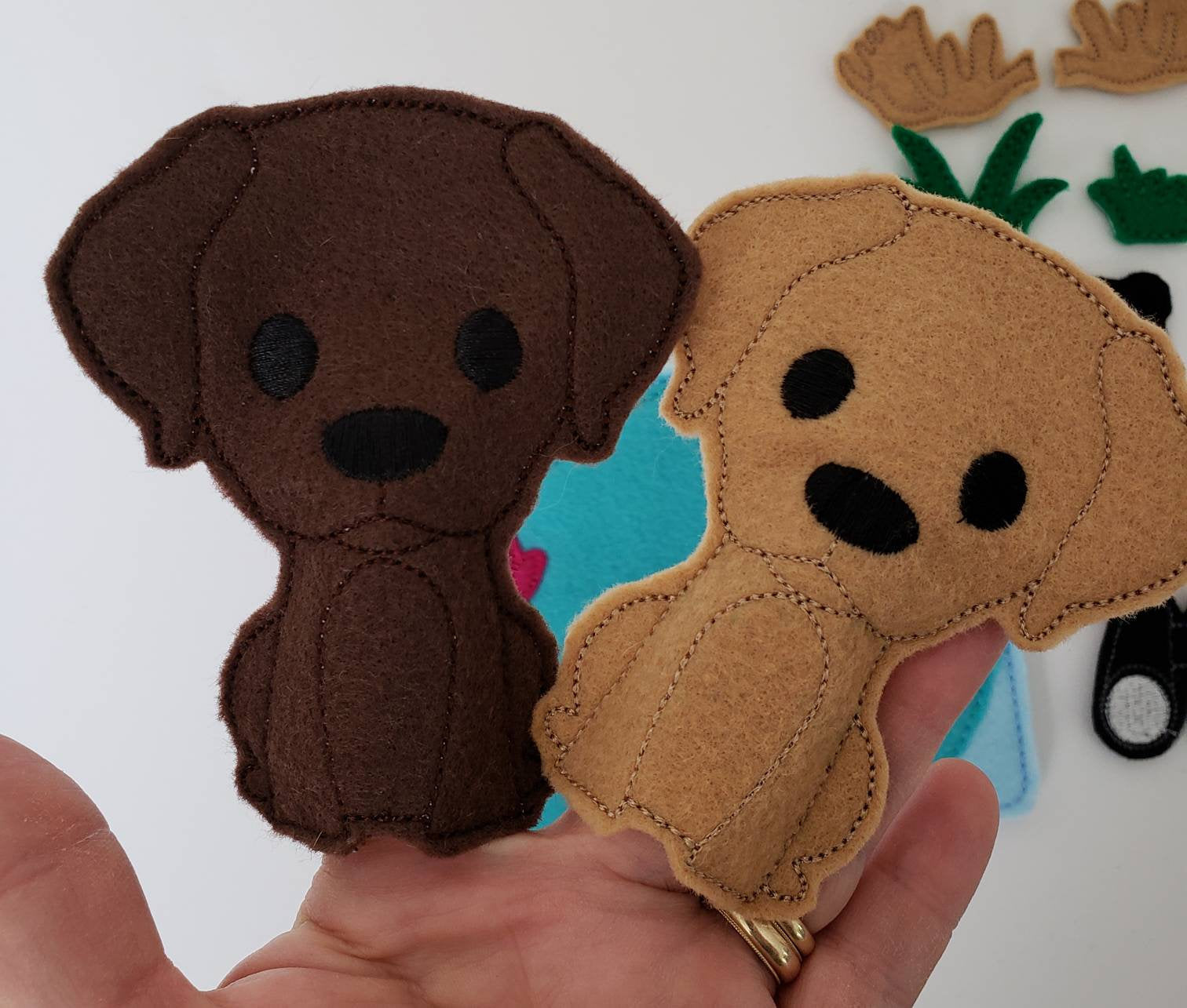 This set is for one felt quiet book page with two dog finger puppets, a felt compass, binoculars, flying duck, and antlers. All the pieces are made put of felt and embroidered on my embroidery machine. The back of the page had a pocket to keep all your pieces in.