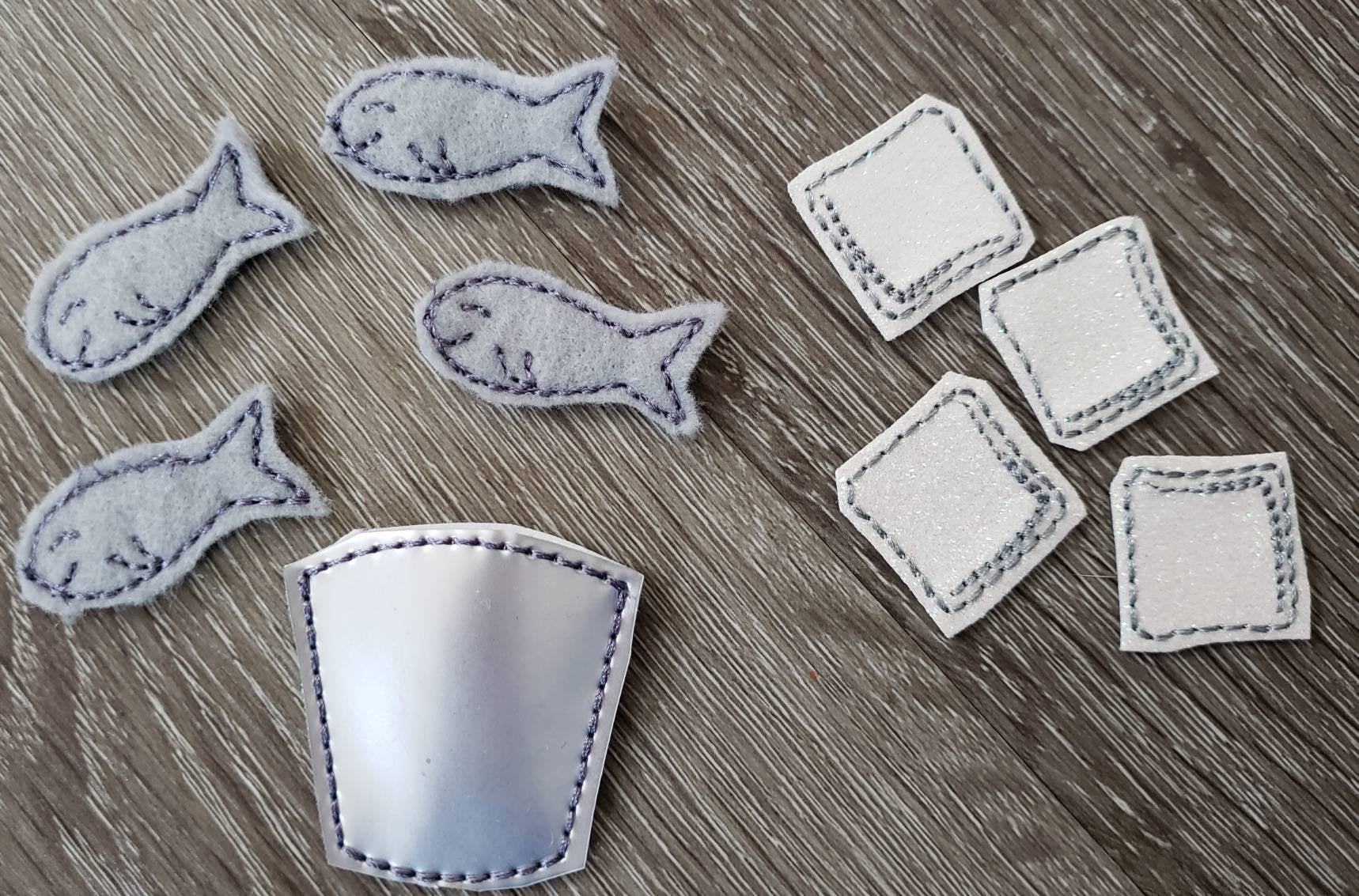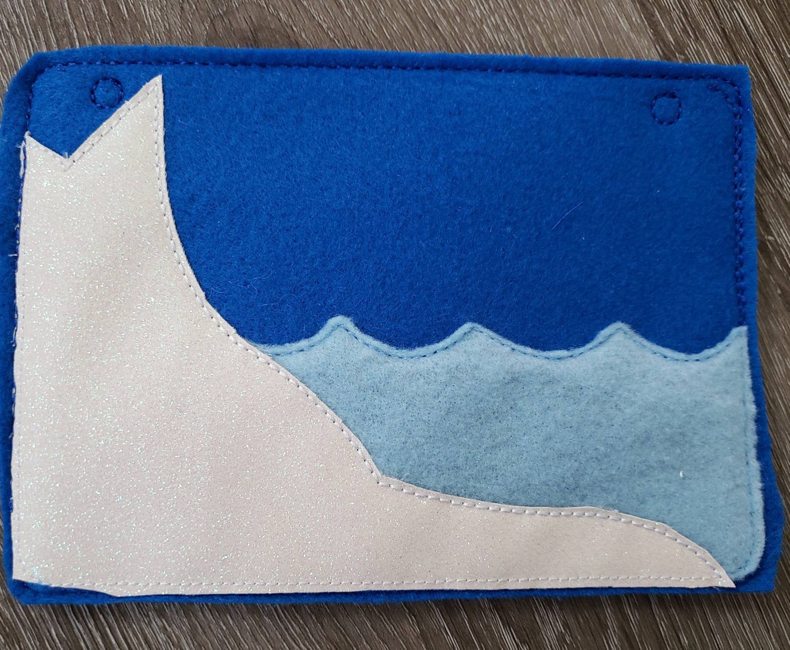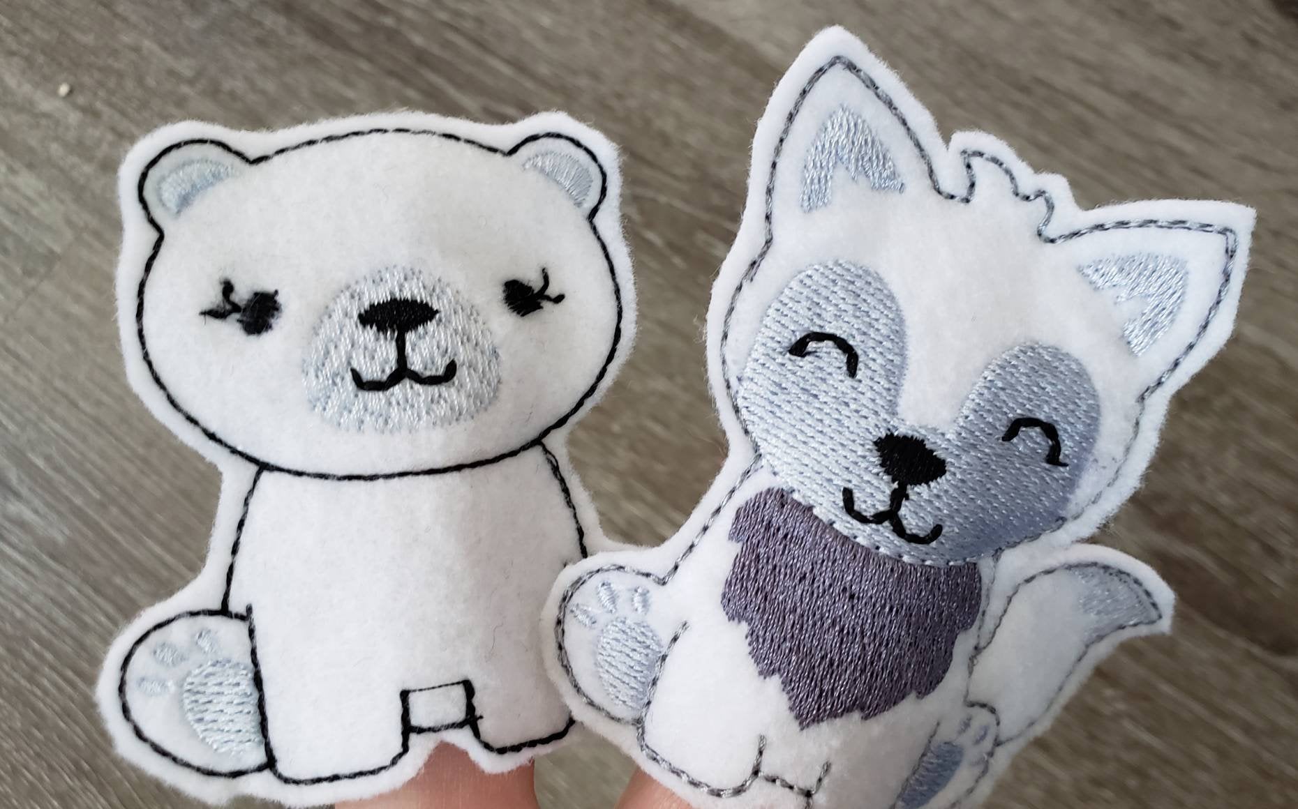 This listing is for an arctic animal felt finger puppets set. This set includes a penguin, polar bear, seal, narwhal, and wolf puppet. There is also a small bucket of fish and some ice cube pieces, and an arctic themed storage bag to keep everything in. Each finger puppet and bag is embroidered on my embroidery machine in eco acrylic felt and vinyl.