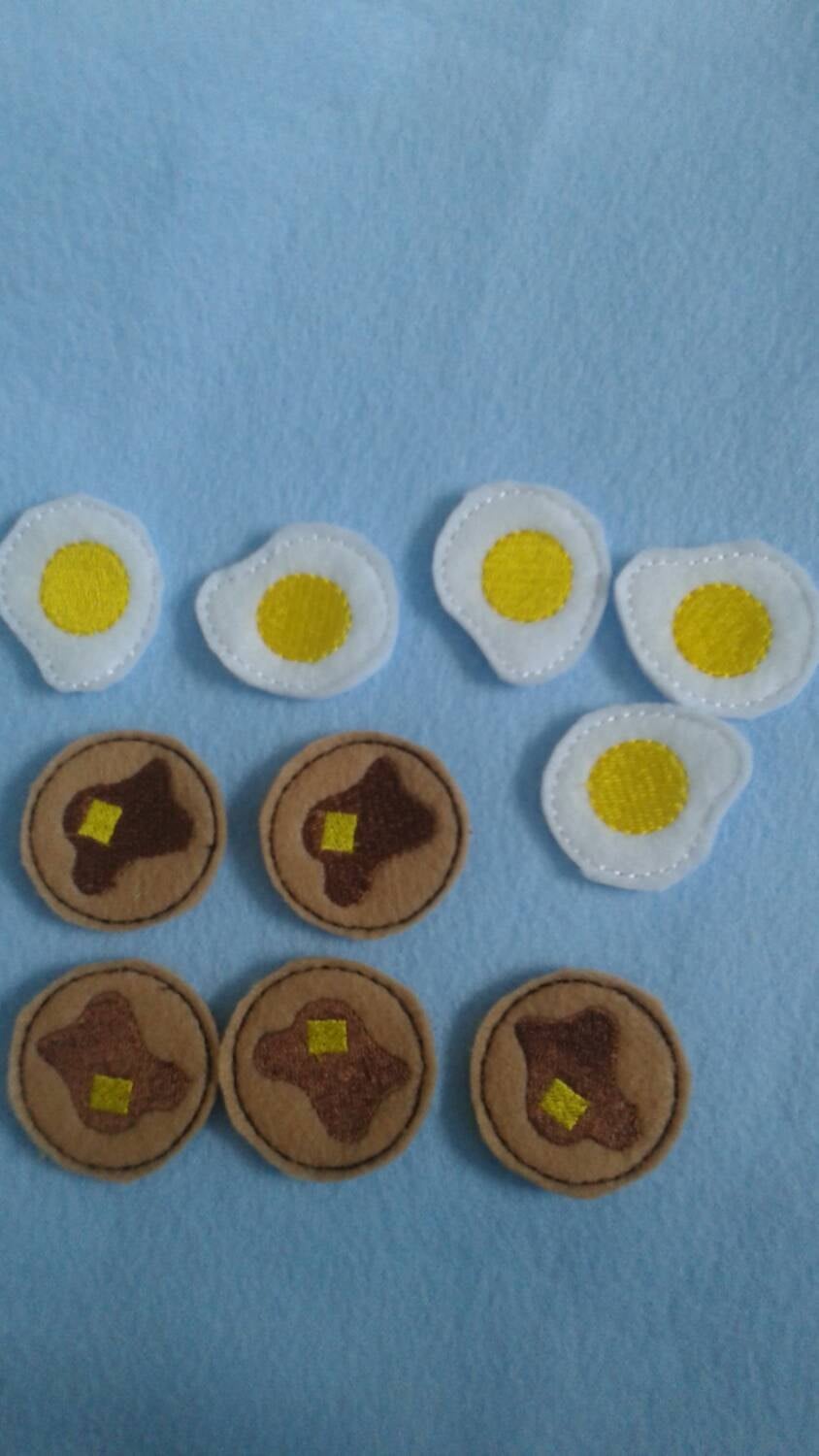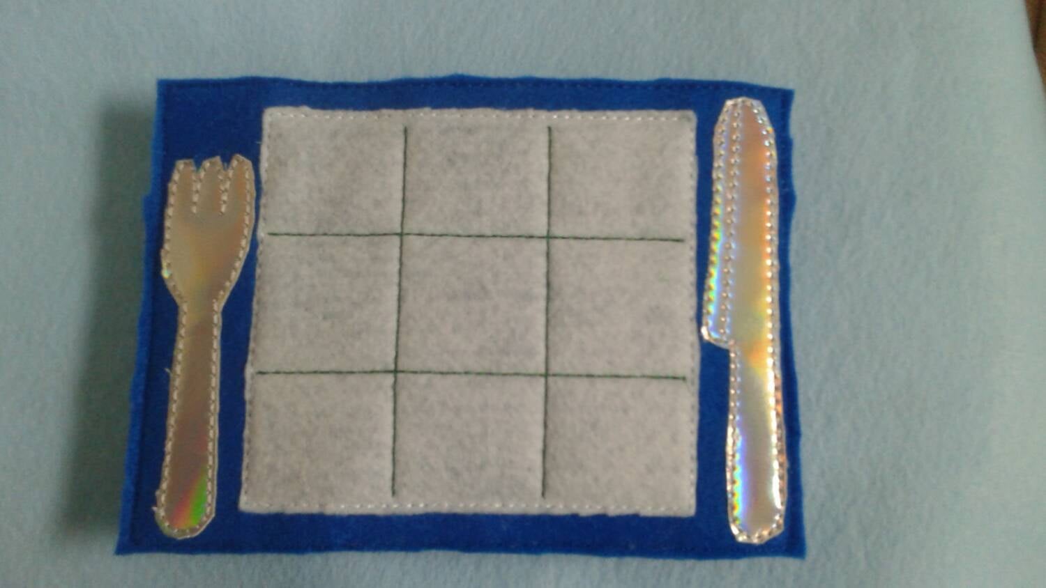 This listing is for this breakfast food tic tac toe game board and pieces. This set includes the board (placemat, fork and knife), five egg pieces and five pancake pieces. There is a pocket on the back of the board to keep all your pieces in one place.