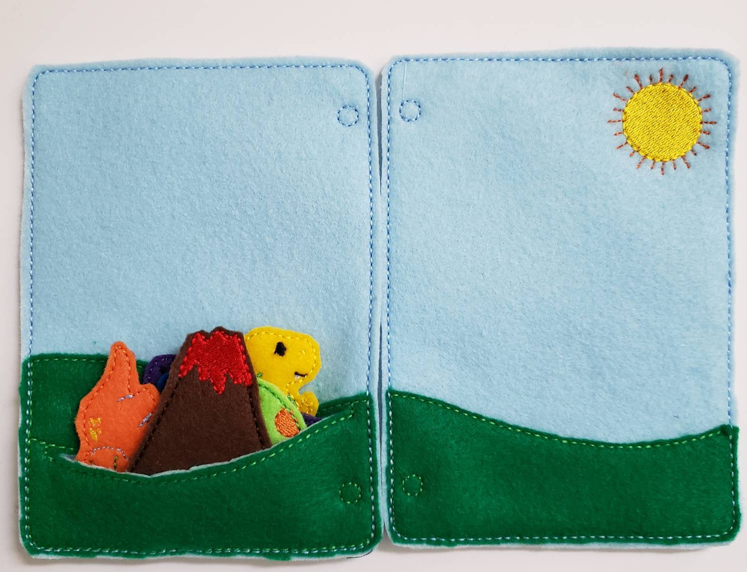 This listing is for four felt dinosaurs, one felt egg, and one felt volcano. There is also two pages that have a scene on them to play with your dinosaurs. There is also a pocket to keep everything in when you are finished playing. The pages are approximately 5x7. They are made out of felt and embroidered on my embroidery machine.