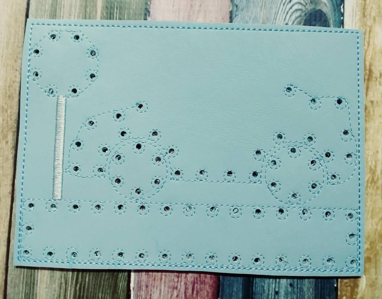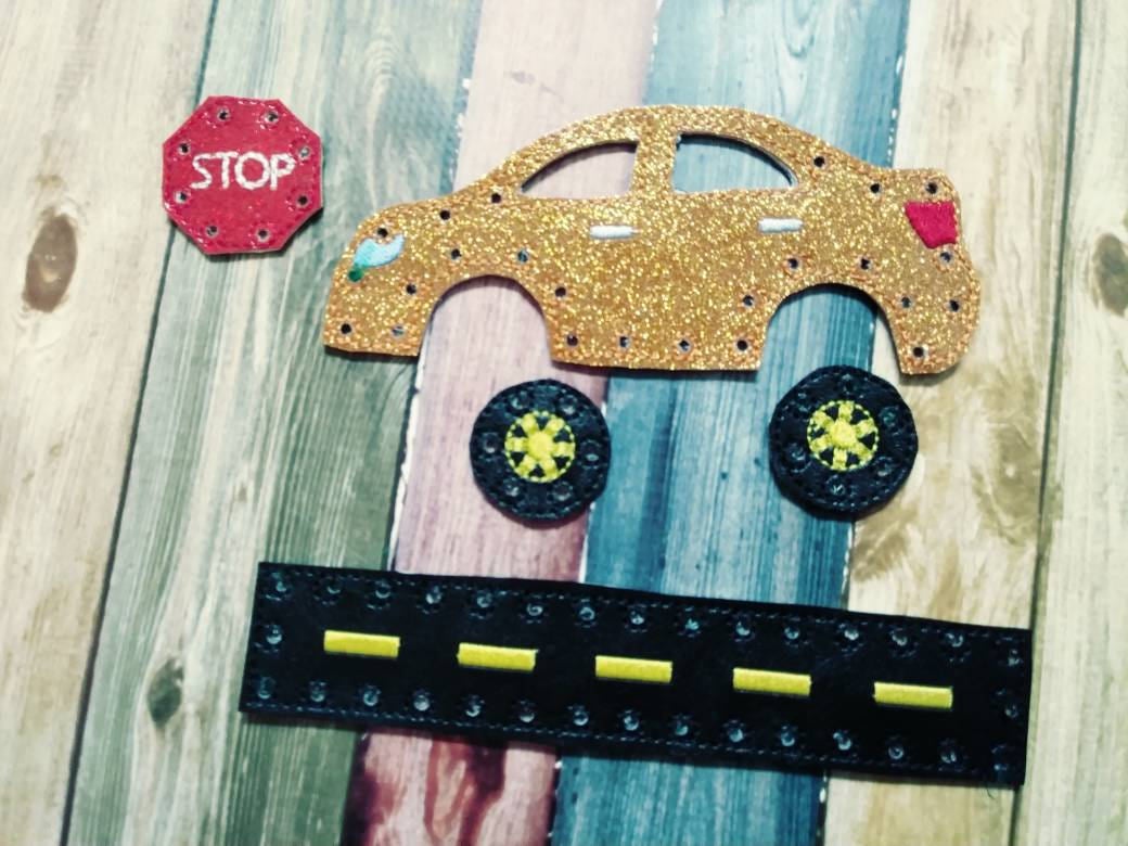 This car sewing card set comes with the board and five pieces to sew on. The pieces included in this set are a car, stop sign, road , and two tires. I will also include a plastic sewing needle and a piece of yarn to help get started. The board is approximately 5 x 7 and is made out of durable vinyl. The pieces are made out of vinyl and embroidered on my embroidery machine. Everything can be wiped clean if they get dirty. This is a sample picture. I can make this board in other colors if you would like something different. Please let me know if you would like me to put eyelets in it, so you can put it into a quiet book.