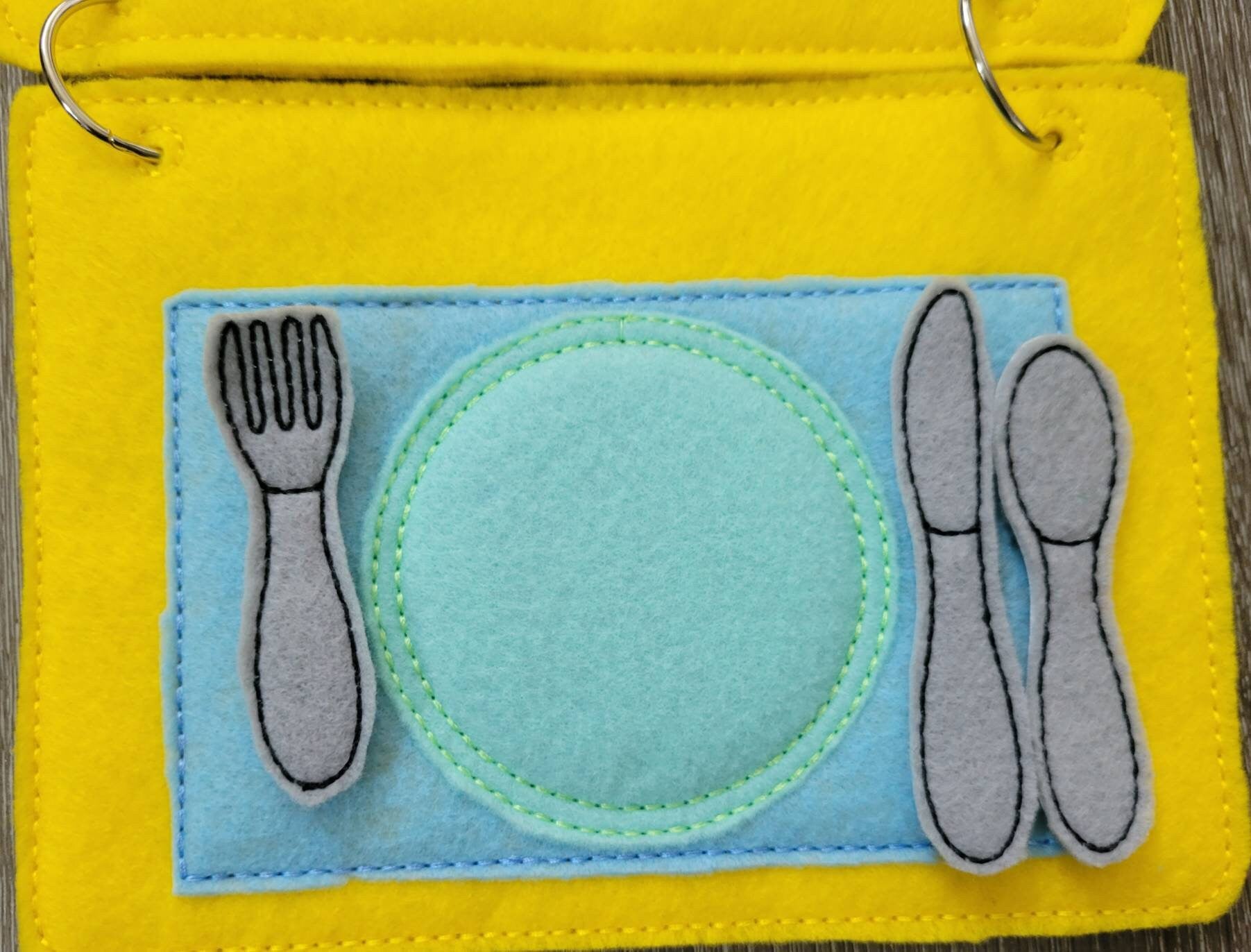 I can't say how many times I have had to tell my daughters which side the fork, knife and spoon go next to a plate. I love this quiet book page because part of it is teaching this skill!